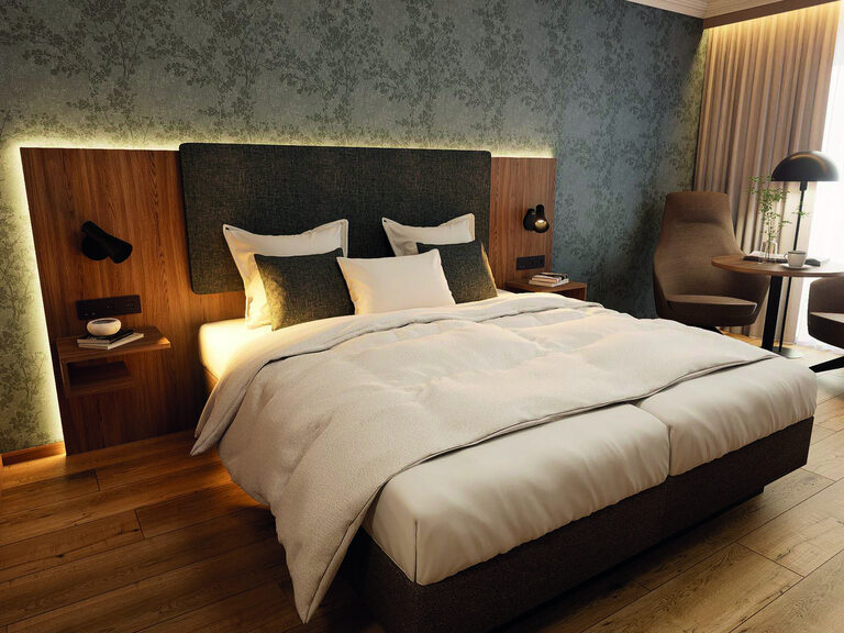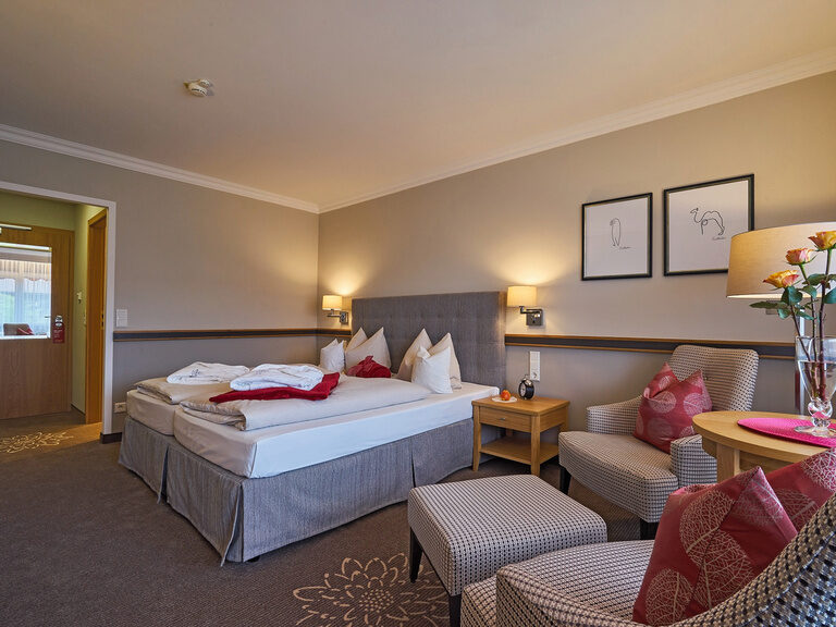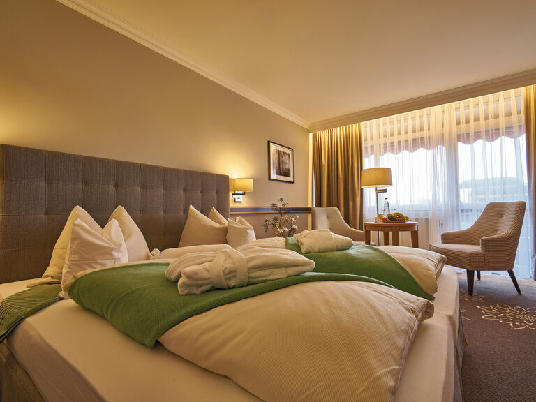 Wahlweise mit getrennt stehenden Betten, inkl. täglichem Hotelzimmerservice Montag - Samstag, nach jeder 4. Nacht Bettwäschewechsel, Frotteewäschewechsel nach Wunsch, Leihbademantel und -badetasche mit Badetuch, Frotteeslipper sowie div. Kosmetikartikel