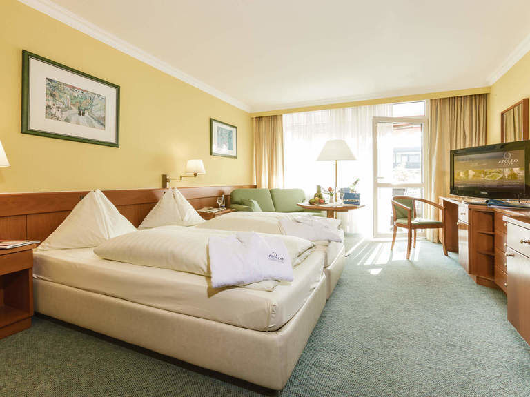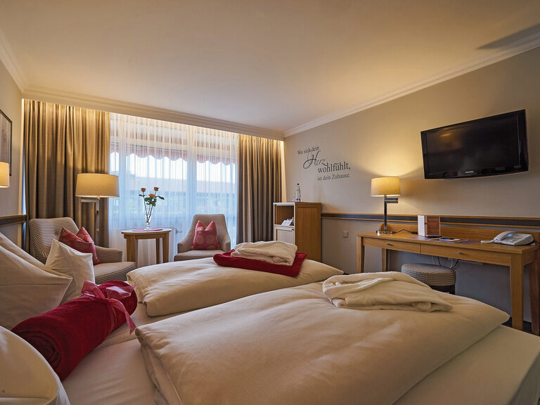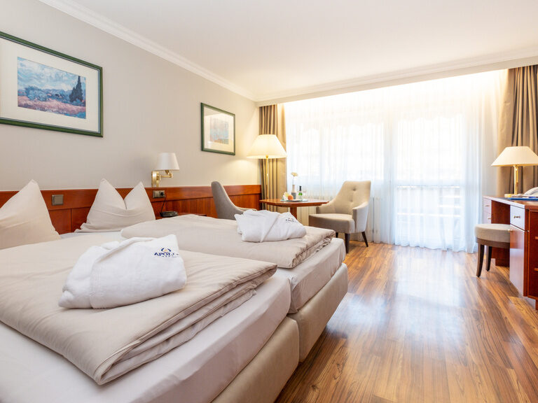 Alle Zimmer (ca. 28 qm) sind ausgestattet mit Dusche/WC, Föhn, allergikerfreundlichem Teppichboden, zwei Einzelbetten (90 x 200), Farb-TV mit integriertem Radio, Telefon, Zimmersafe, W-Lan, Sitzecke mit zwei Sessel und Tisch, Minibar, Wasserkocher, Instantkaffee, Teeauswahl; Balkon mit zwei Stühlen und Tisch